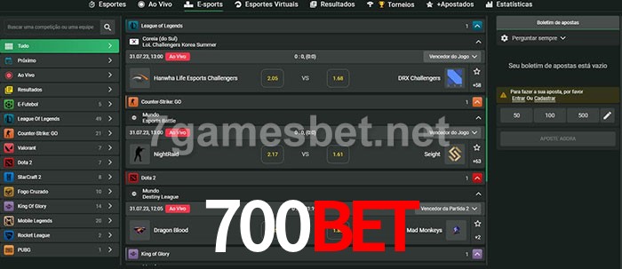 O 700bet oferece uma grande seleção de opções de apostas em e-sports com probabilidades competitivas